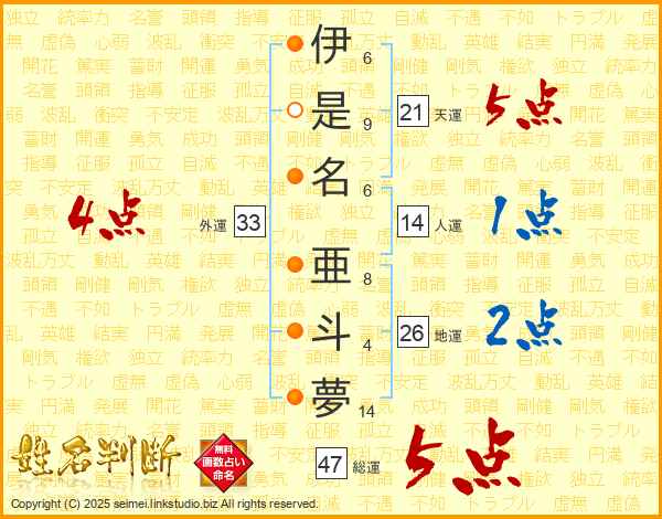 伊(6画)是(9画)名(6画) 亜(8画)斗(4画)夢(14画)