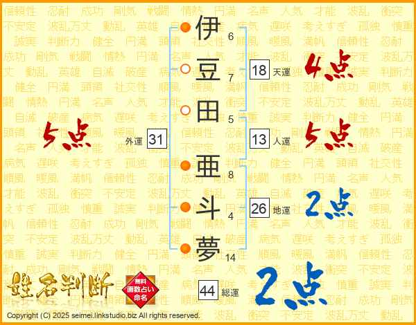 伊(6画)豆(7画)田(5画) 亜(8画)斗(4画)夢(14画)