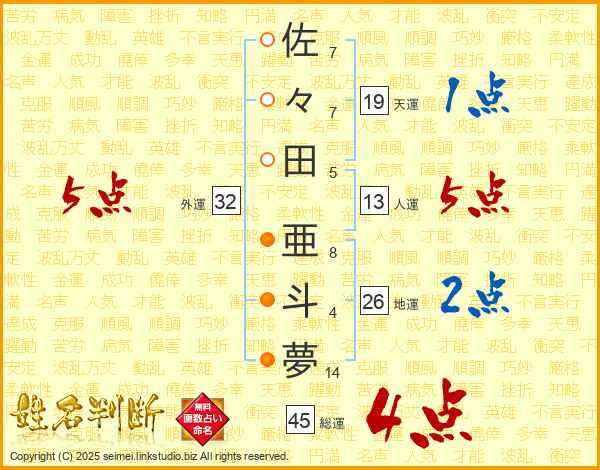 佐(7画)々(7画)田(5画) 亜(8画)斗(4画)夢(14画)