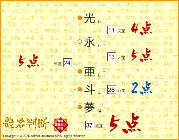 光永亜斗夢さんの総運は37画の5点!
