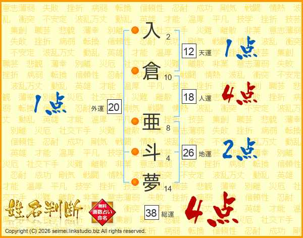 入倉亜斗夢さんの総運は38画の4点!