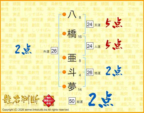 八橋亜斗夢さんの人運は24画の5点!