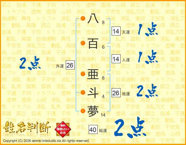 八百亜斗夢さんの地運は26画の2点!