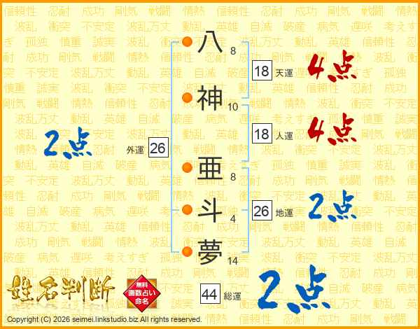 八神亜斗夢さんの外運は26画の2点!