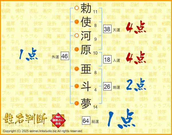 勅(11画)使(8画)河(9画)原(10画) 亜(8画)斗(4画)夢(14画)