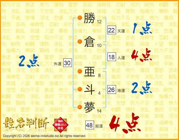 勝(12画)倉(10画) 亜(8画)斗(4画)夢(14画)