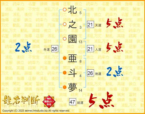 北(5画)之(3画)園(13画) 亜(8画)斗(4画)夢(14画)
