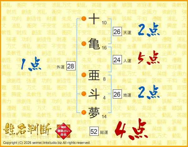 十(10画)亀(16画) 亜(8画)斗(4画)夢(14画)