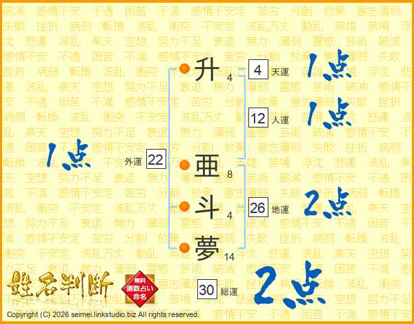 升(4画) 亜(8画)斗(4画)夢(14画)