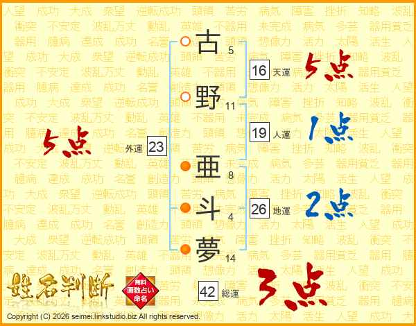 古(5画)野(11画) 亜(8画)斗(4画)夢(14画)
