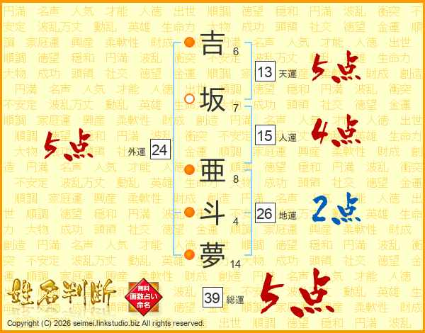 吉坂亜斗夢さんの総運は39画の5点!