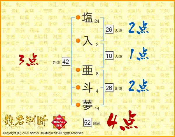 塩(24画)入(2画) 亜(8画)斗(4画)夢(14画)