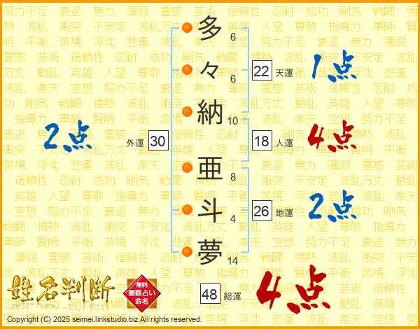 多(6画)々(6画)納(10画) 亜(8画)斗(4画)夢(14画)