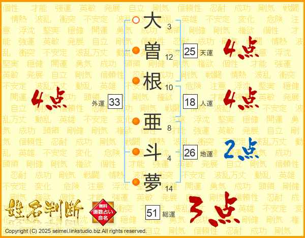 大(3画)曽(12画)根(10画) 亜(8画)斗(4画)夢(14画)