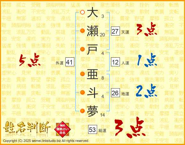 大(3画)瀬(20画)戸(4画) 亜(8画)斗(4画)夢(14画)