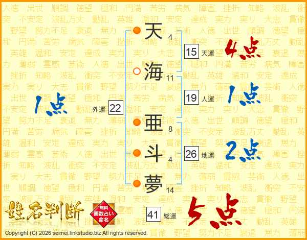 天(4画)海(11画) 亜(8画)斗(4画)夢(14画)