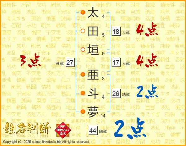 太(4画)田(5画)垣(9画) 亜(8画)斗(4画)夢(14画)