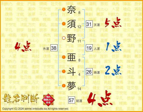 奈須野亜斗夢さんの総運は57画の4点!