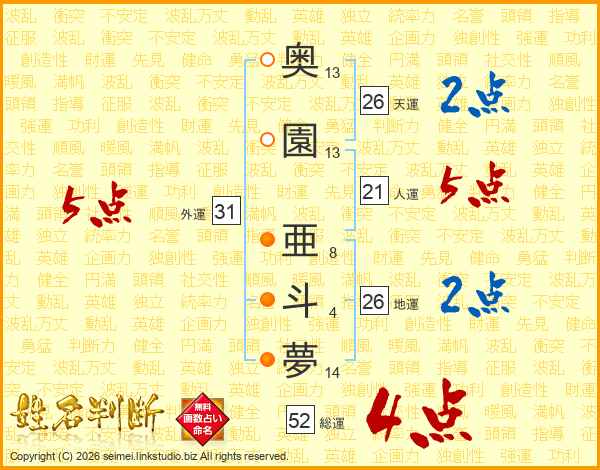 奥園亜斗夢さんの総運は52画の4点!