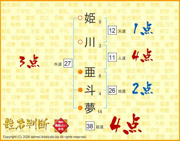 姫川亜斗夢さんの総運は38画の4点!