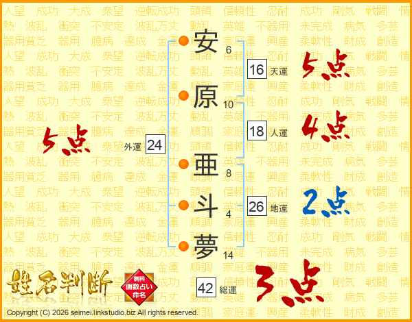 安原亜斗夢さんの天運は16画の5点!