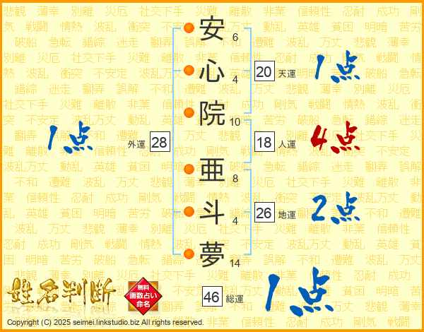 安心院亜斗夢さんの総運は46画の1点!