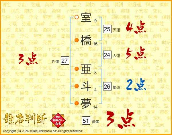 室橋亜斗夢さんの地運は26画の2点!