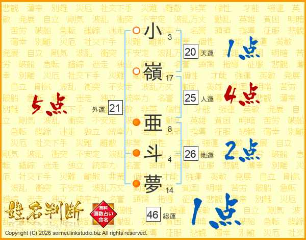 小嶺亜斗夢さんの外運は21画の5点!