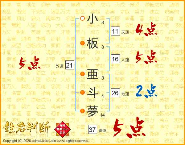 小(3画)板(8画) 亜(8画)斗(4画)夢(14画)