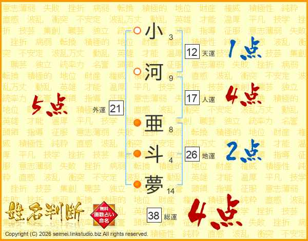 小(3画)河(9画) 亜(8画)斗(4画)夢(14画)