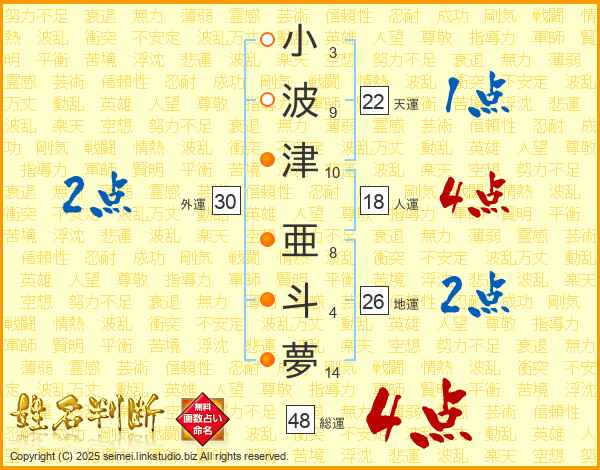 小(3画)波(9画)津(10画) 亜(8画)斗(4画)夢(14画)