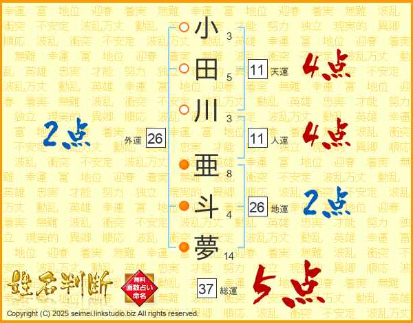 小(3画)田(5画)川(3画) 亜(8画)斗(4画)夢(14画)