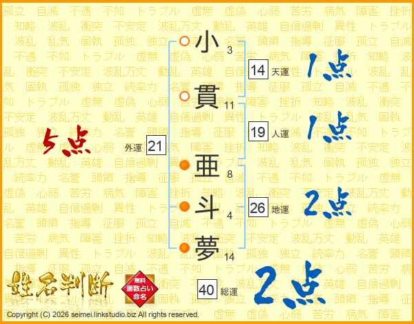 小(3画)貫(11画) 亜(8画)斗(4画)夢(14画)