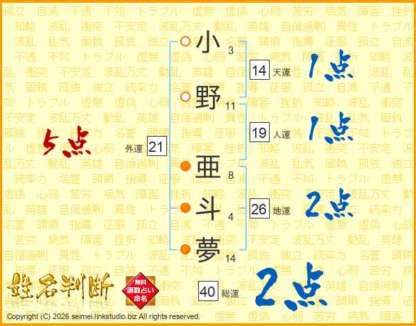 小(3画)野(11画) 亜(8画)斗(4画)夢(14画)