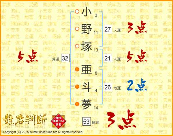 小(3画)野(11画)塚(13画) 亜(8画)斗(4画)夢(14画)