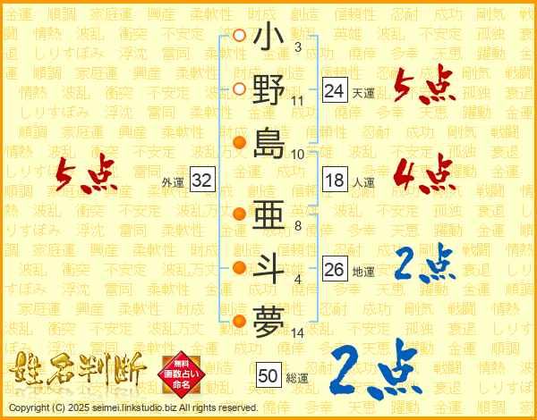 小(3画)野(11画)島(10画) 亜(8画)斗(4画)夢(14画)