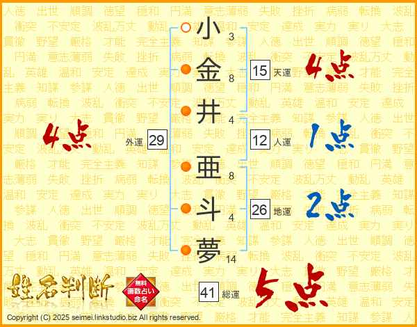 小(3画)金(8画)井(4画) 亜(8画)斗(4画)夢(14画)