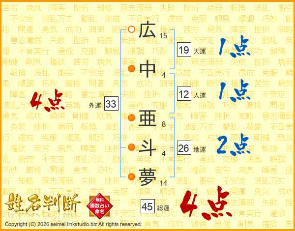 広(15画)中(4画) 亜(8画)斗(4画)夢(14画)