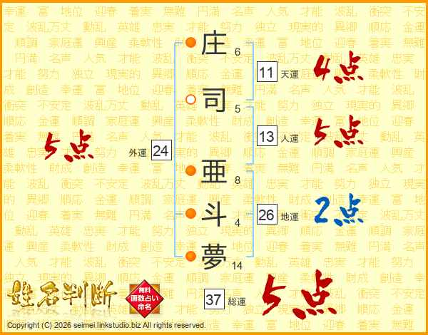 庄(6画)司(5画) 亜(8画)斗(4画)夢(14画)