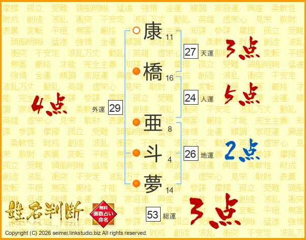 康橋亜斗夢さんの総運は53画の3点!
