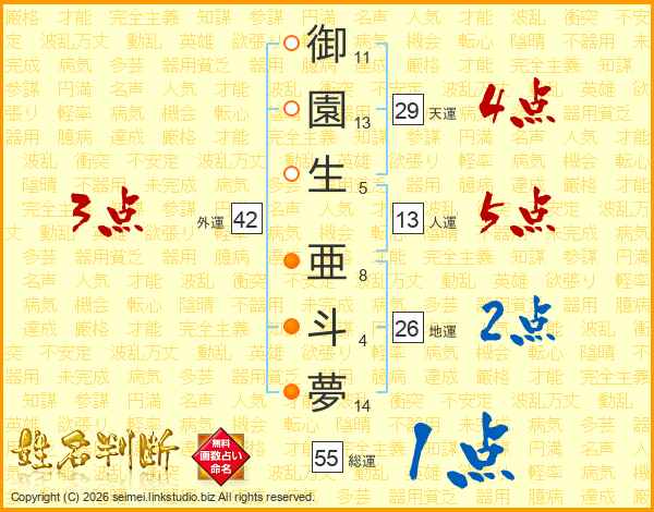 御(11画)園(13画)生(5画) 亜(8画)斗(4画)夢(14画)