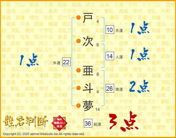 戸次亜斗夢さんの総運は36画の3点!