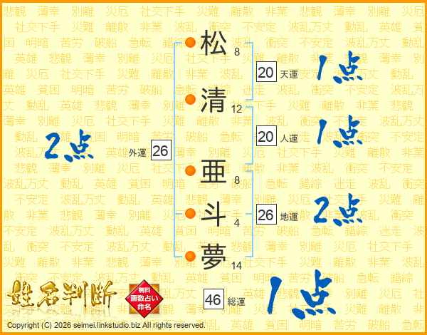 松(8画)清(12画) 亜(8画)斗(4画)夢(14画)