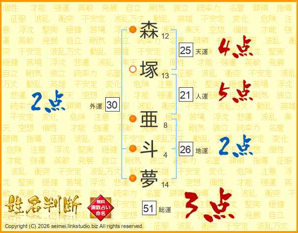 森塚亜斗夢さんの天運は25画の4点!