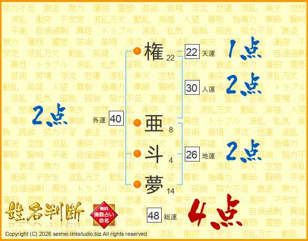 権(22画) 亜(8画)斗(4画)夢(14画)