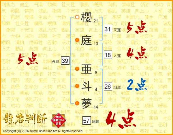 櫻(21画)庭(10画) 亜(8画)斗(4画)夢(14画)