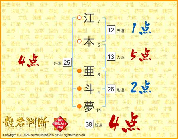 江(7画)本(5画) 亜(8画)斗(4画)夢(14画)