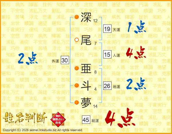 深(12画)尾(7画) 亜(8画)斗(4画)夢(14画)