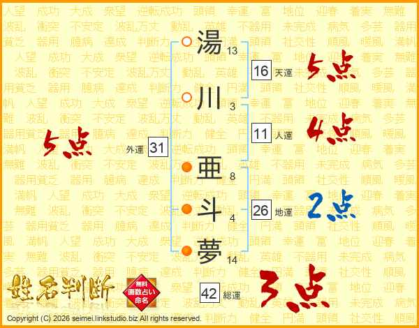 湯(13画)川(3画) 亜(8画)斗(4画)夢(14画)