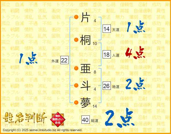 片桐亜斗夢さんの総運は40画の2点!